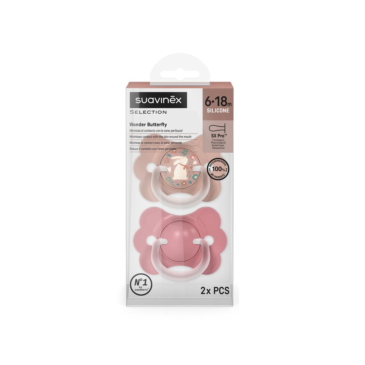 SUAVINEX | Dudlík SX PRO fyziologický 2 ks BUTTERFLY WONDERLAND NEW 6/18m - růžový králík + růžový