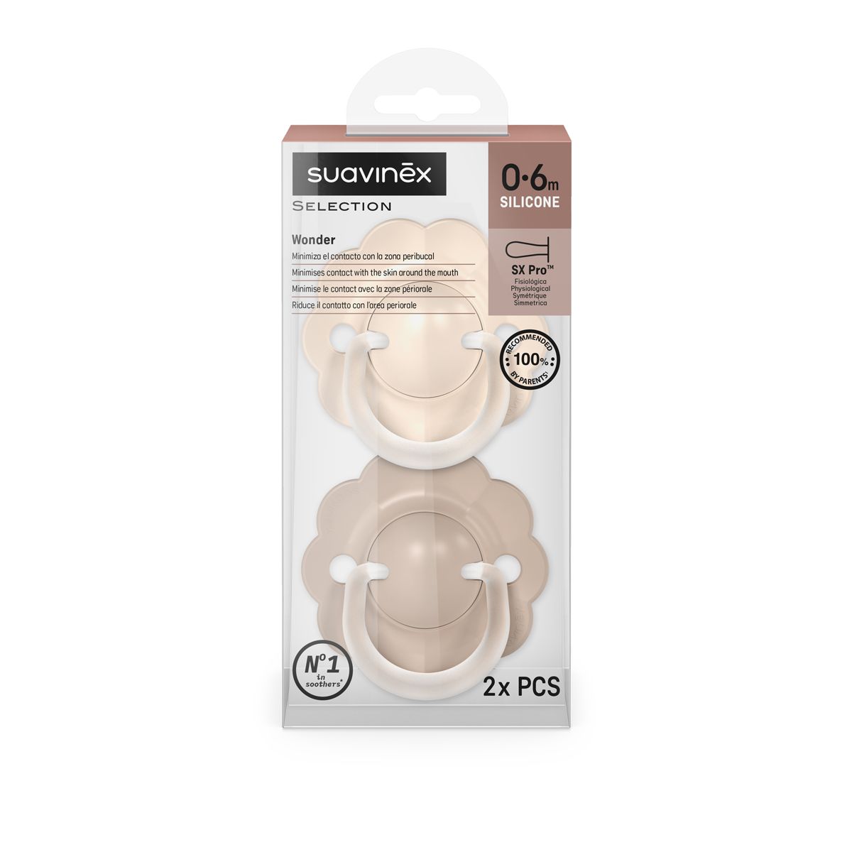 Dudlíky Wonderland jsou vybaveny fyziologickou savičkou SX Pro ze silikonu, která respektuje přirozený vývoj ústní dutiny dítěte. Díky plochému a symetrickému tvaru se vždy správně přizpůsobí v ústech.