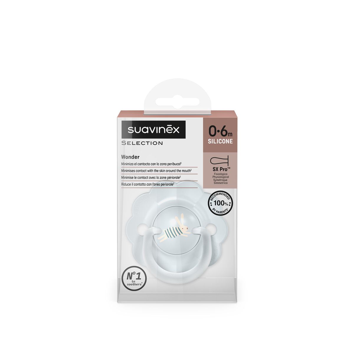 Dudlíky Wonderland jsou vybaveny fyziologickou savičkou SX Pro ze silikonu, která respektuje přirozený vývoj ústní dutiny dítěte. Díky plochému a symetrickému tvaru se vždy správně přizpůsobí v ústech.