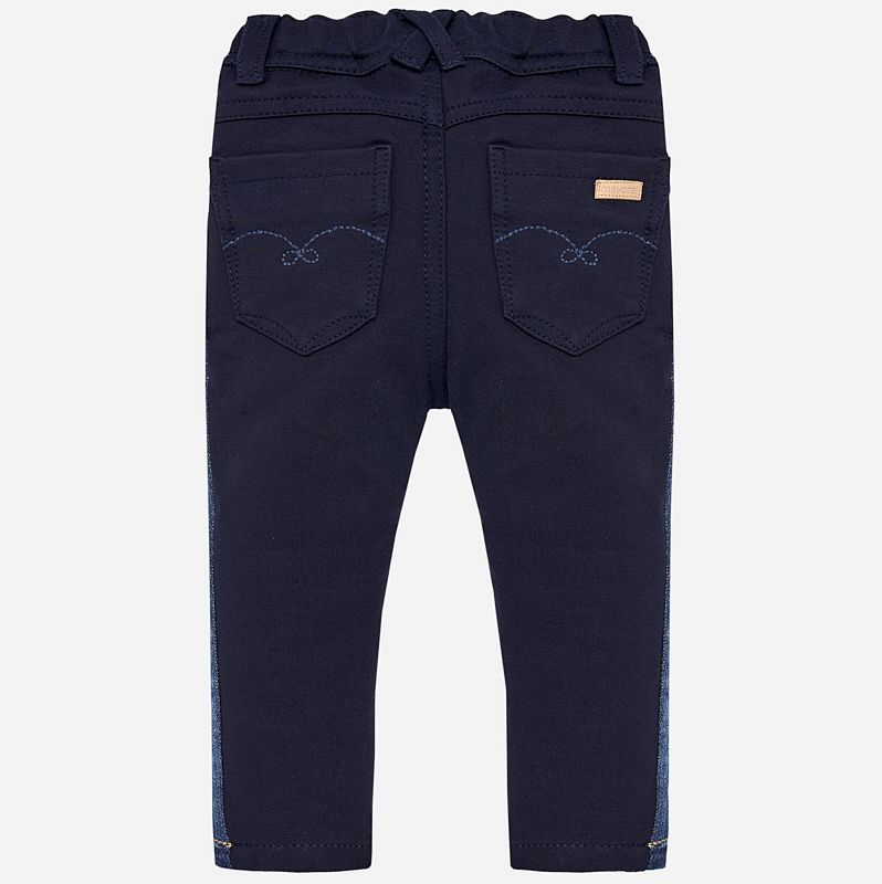 Krásné dlouhé kalhoty pro holčičku od kvalitní španělské značky MAYORAL. Elegantní kalhoty s nastavitelným pasem, kapsami a zadními kapsami na knoflíky. Zvláštní design - zepředu riflový a zezadu teplákový vzhled.