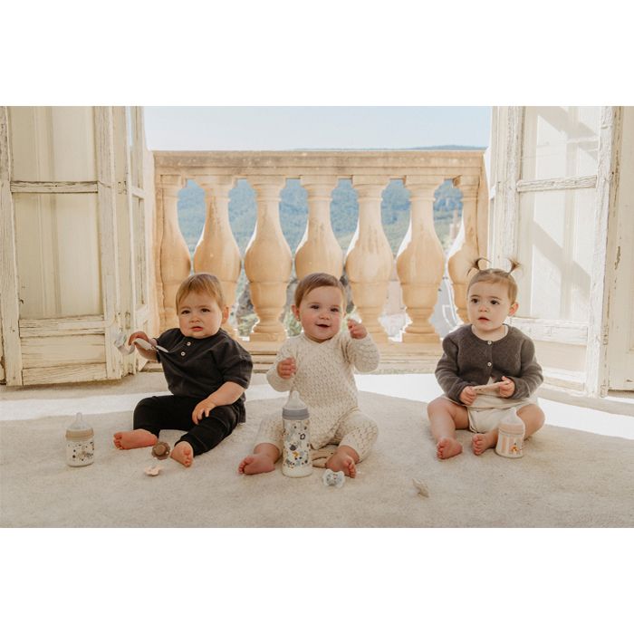· Umožňuje větší přizpůsobivost, protože novorozené dítě bude spočívat svými rty na střed základny, zatímco starší děti s většími ústy budou moci své rty přiblížit až k vnější hraně, přičemž celý dudlík uvnitř se nachází uvnitř úst.