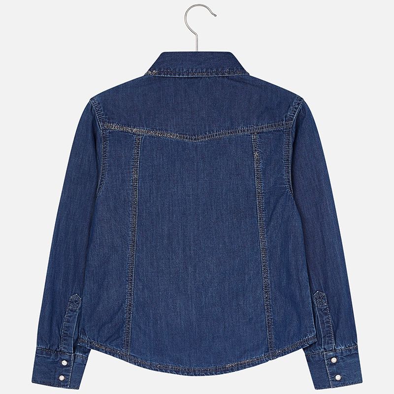Krásná tmavě modrá JEANS košile dlouhý rukáv pro holčičku od kvalitní značky MAYORAL. Moderní košile s ozdobnými rukávky, kapsičkami a stříbrným lemováním.