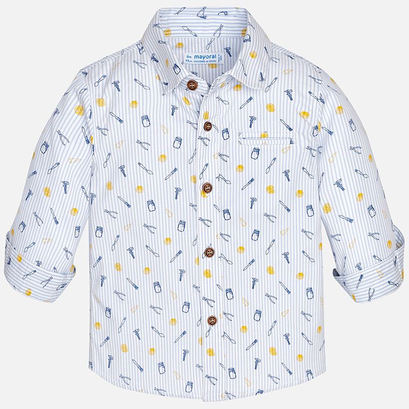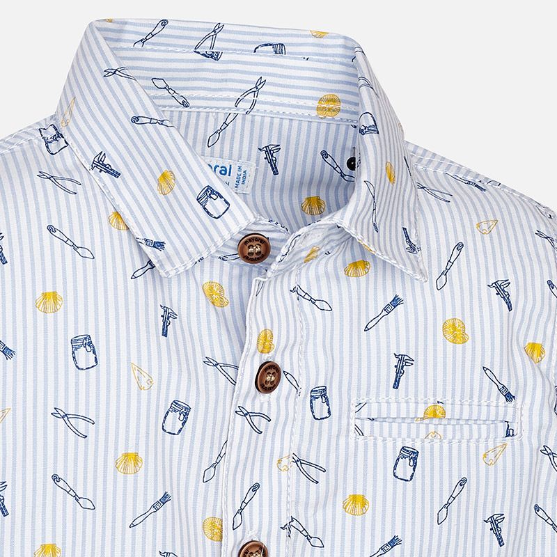 Stylová lehoučká košile se vzorem na léto s límečkem a kapsičkou pro chlapečka od kvalitní španělské značky MAXORAL. Košile má dlouhý rukáv, který lze ohrnout.