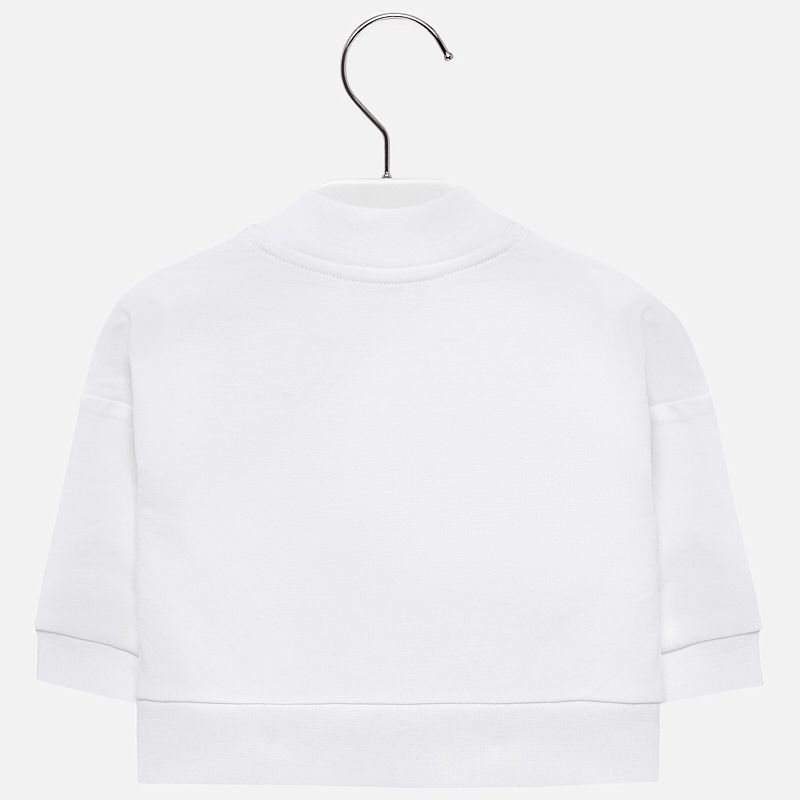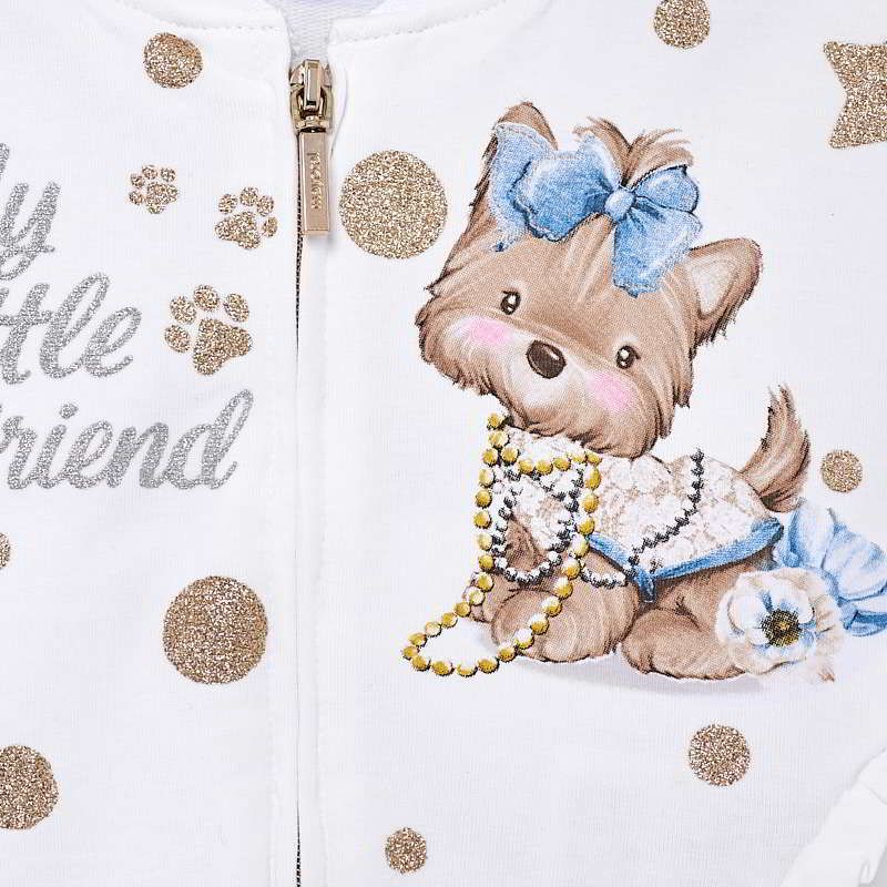 Krásná bílá mikinka na rozepnutí bez kapuce pro malou parádnici od kvalitní španělské značky MAYORAL. Originální mikinka s obrázkem pejska na přední straně.
