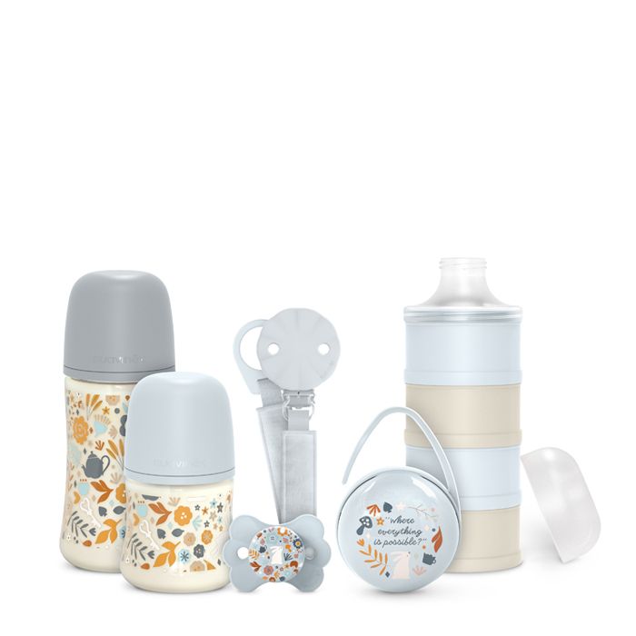• 1 lahvička o objemu 270 ml s fyziologickou (kulatou) silikonovou savičkou s 3-pozičním průtokem, který umožňuje nastavit lahvičku dle schopnosti sání dítěte. 3-poziční savičkou lze koordinovat sílu průtoku pokrmu pouhým pootáčením. Širokohrdlá láhev umožňuje rodičům snazší mytí a přípravu pokrmu, láhev je lépe stabilní