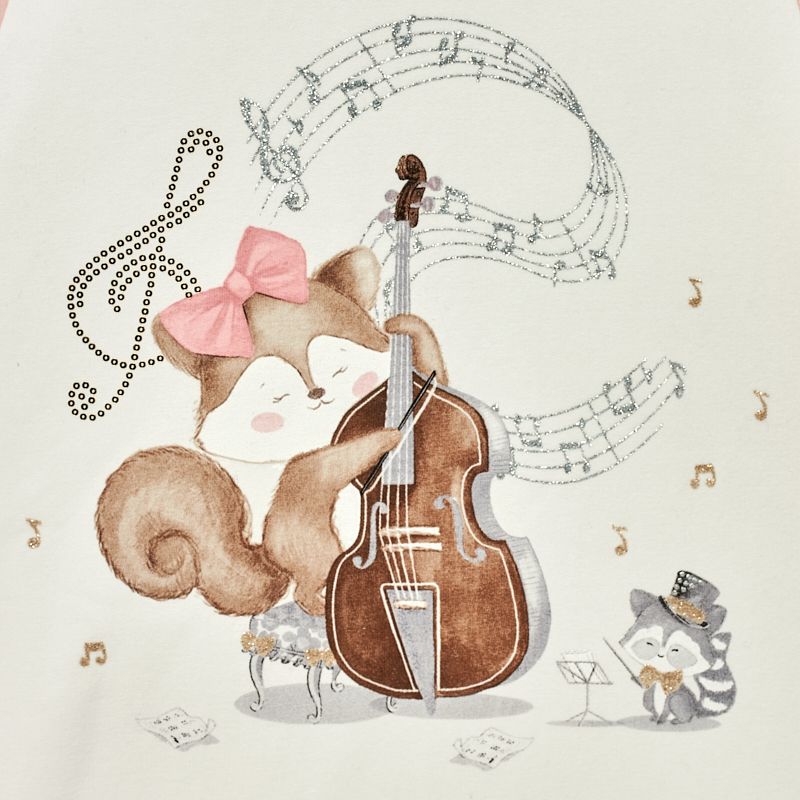 Bílé šatičky s růžovými zády a rukávky a liškou hrající na basu.