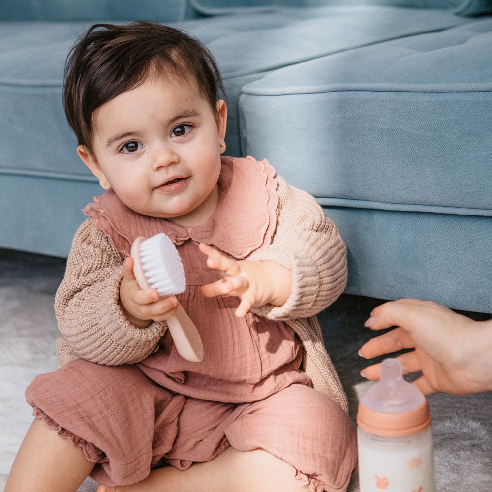 Set hřebenu a kartáčku je ideálním pomocníkem pro každodenní péči o vlásky děťátka. Dopřejte jemnou masáž i miminku, které má jen jemné chmýří. Kartáč i hřeben jsou bez ostrých a nebezpečných hran, které by mohly být dítěti nebezpečné. Zuby hřebínku mají zaoblené konce a vlákna kartáčku jsou měkoučké a pružné. Ideální pro jemnou dětskou pokožku i vlásky, vhodné pro miminka od narození.