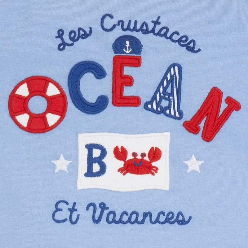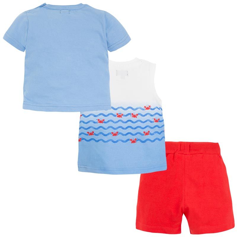 Krásný letní setík pro malého frajera od kvalitní španělské značky MAYORAL. Originální triko se záchraným kolem + námořnický nátělník a červené kraťásky.
