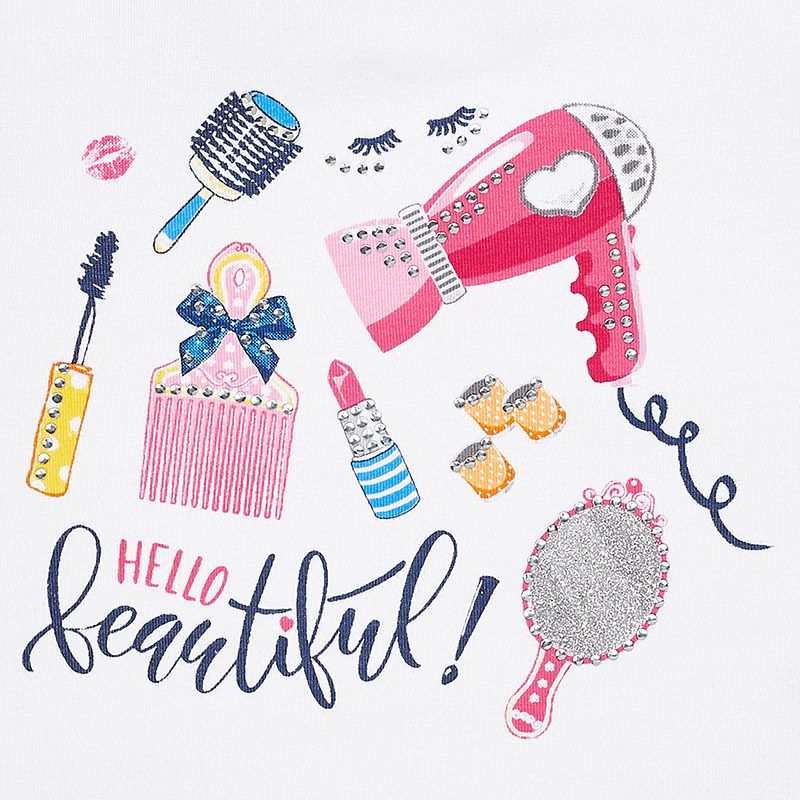 Krásný setík pro malou parádnici od kvalitní španělské značky MAYORAL. Originální bílé tričko se všemi pomůckami pro krásu malé parádnice + malinové leginy. Tričko ozdobené na zadní straně kanýrkem.