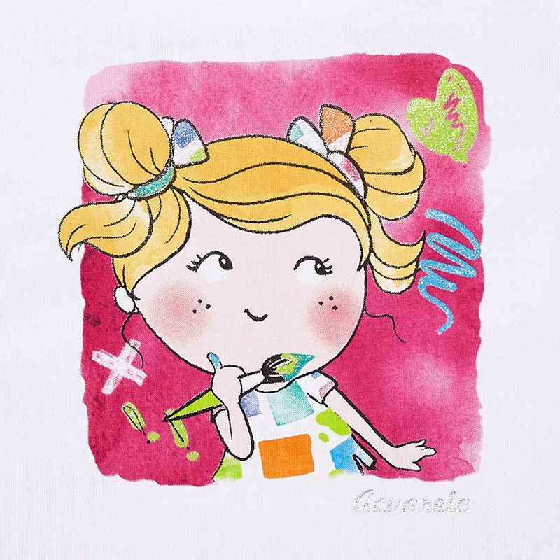 Krásný setík pro malou parádnici od kvalitní španělské značky MAYORAL. Originální bílé tričko vzadu s mašličkou a obrázkem malé malířky + malinové leginky.
