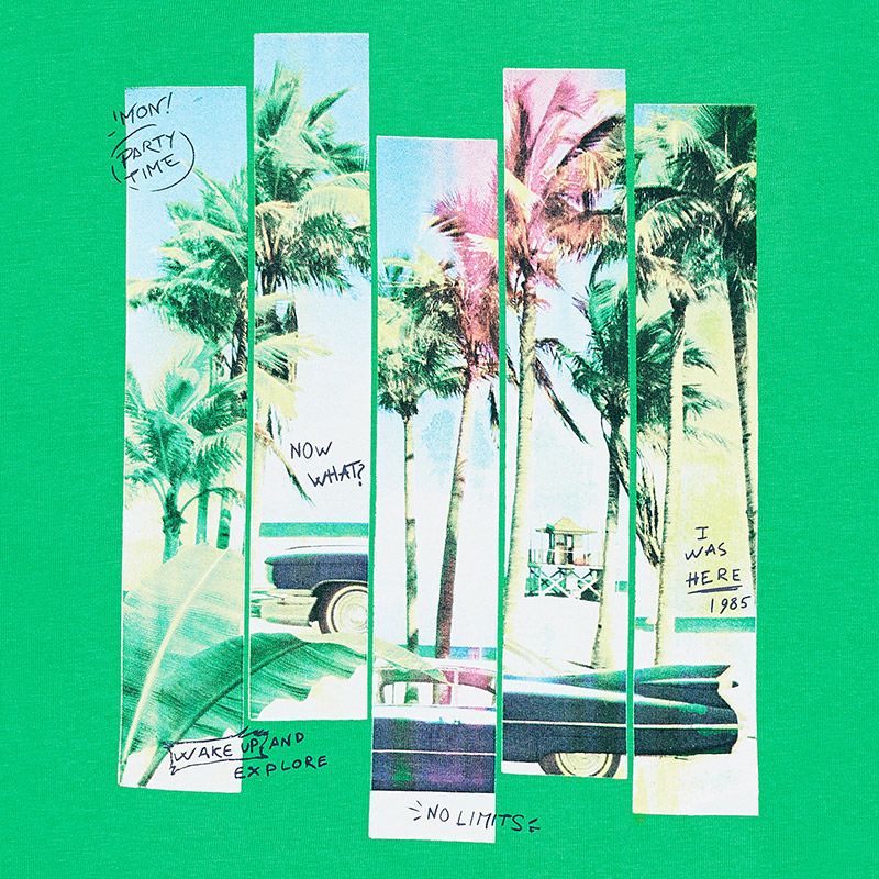 Krásný letní setík pro malého frajera od kvalitní španělské značky MAYORAL. Originální zelené tričko s palmami + pruhovaný nátelník a modré kraťásky.