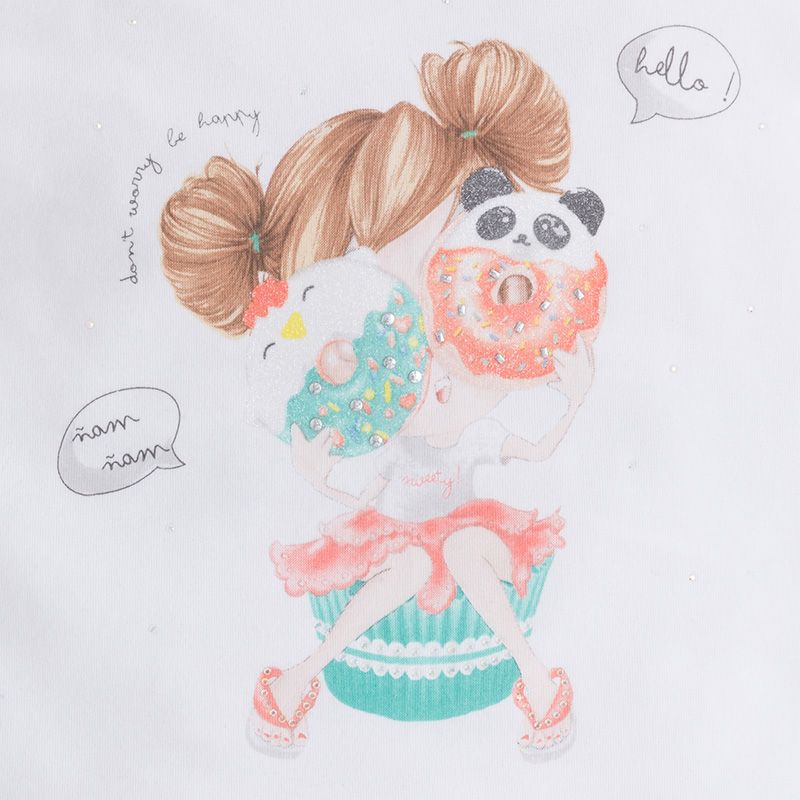 Krásný letní setík pro malou parádnici od kvalitní španělské značky MAYORAL. Originální tričko s třásněmi a holčičkou s donuty a krásné broskvové leginky.