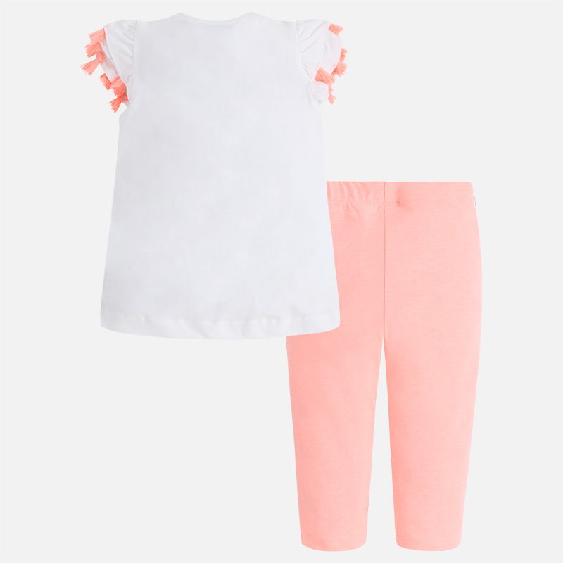 Krásný letní setík pro malou parádnici od kvalitní španělské značky MAYORAL. Originální tričko s třásněmi a holčičkou s donuty a krásné broskvové leginky. Materiál: - triko: 95% bavlna + 5% elastan - leginy: 62% polyester + 33% bavlna + 5% elastan