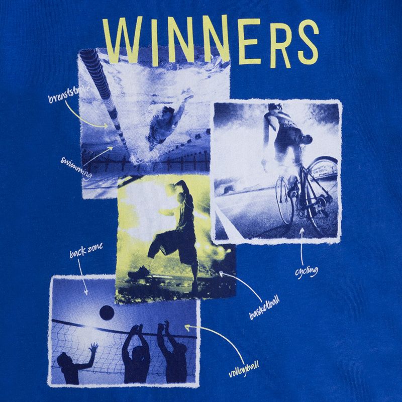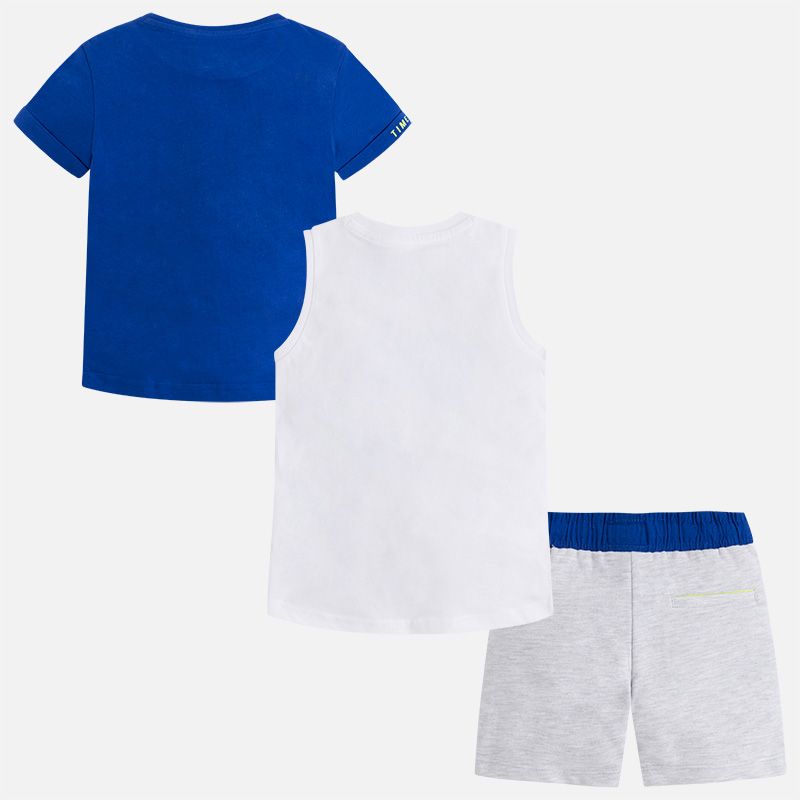 Krásný letní setík pro malého frajera od kvalitní španělské značky MAYORAL. Originální modré tričko SPORT + bílý nátelník a šedé kraťásky.