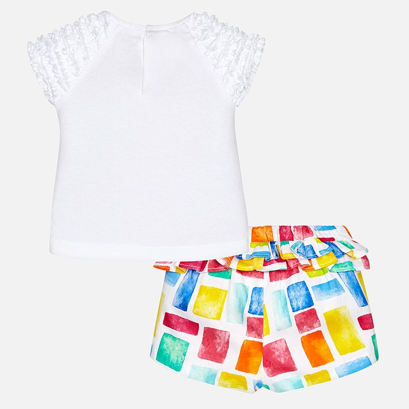 Krásný letní setík pro malou parádnici od kvalitní španělské značky MAYORAL. Originální bílé tričko s kostičkovanou kabelkou a nařasenými rukávky. Krásné barevné kostkované kraťásky s volánkem na zadečku.