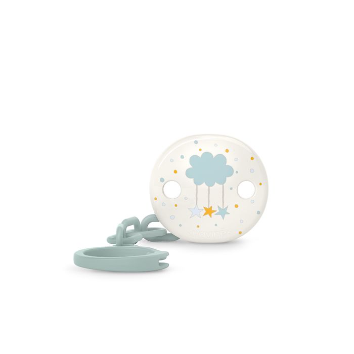 Krásný a praktický. Kulatý klip s veselými obrázky a řetízkem, ke kterému pohodlně připnete dudlík. Klip umožňuje upevnit dudlík na oblečení dítěte a předchází případnému upadnutí dudlíku na nečistou zem anebo jeho ztrátě.