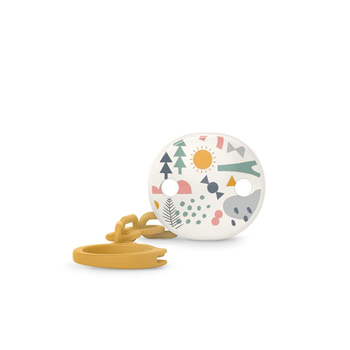 Krásný a praktický. Kulatý klip s veselými obrázky a řetízkem, ke kterému pohodlně připnete dudlík. Klip umožňuje upevnit dudlík na oblečení dítěte a předchází případnému upadnutí dudlíku na nečistou zem anebo jeho ztrátě.