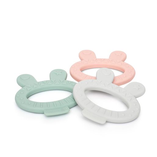 Silikonové kousátko ve tvaru králíčka s drobnými výstupky pro úlevu pro dětské dásně v praktickém boxu pro hygienickou přepravu. Evoluční kousátka jsou bezpečná, ergonomická, lehká a velmi zábavná.