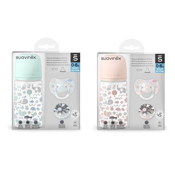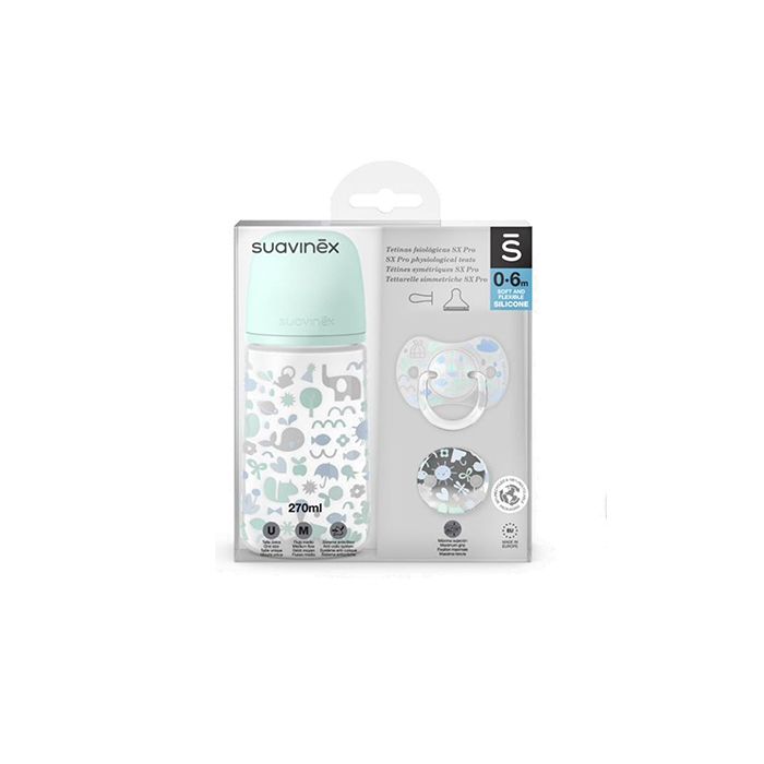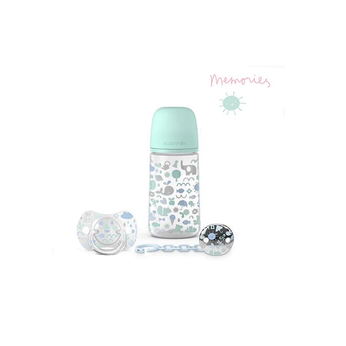 SUAVINEX | SADA LÁHEV 270ml + dudlík fyziologický 0/6m + klip MEMORIES - modrý