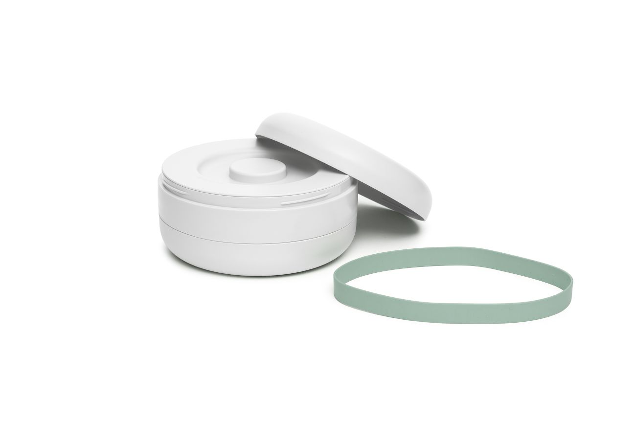 Sada je uzavřena tak, aby se zabránilo úniku jídla. První uzavření pomocí zašroubování, druhé ochrannou gumičkou.