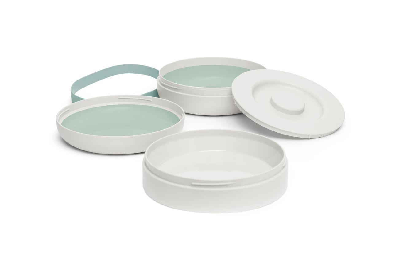 Sada kombinovatelných mističek s kapacitou pro 2 jídla obsahuje hlubší misku pro řidší stravu s kapacitou až 285 ml a centrální misku určenou pro pevnou stravu s kapacitou až 210 ml.