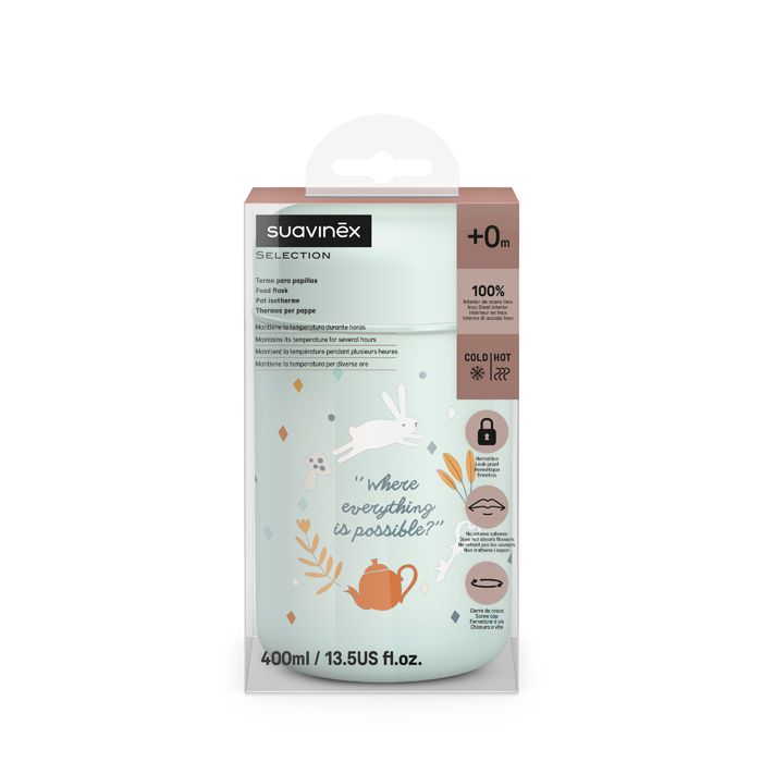 Termoska na příkrmy řady WONDERLAND značky Suavinex umožňuje přepravovat pyré nebo pevné potraviny - uchovává teplotu po dobu až 6 hodiny. Je velkým pomocníkem při výletech s dětmi ven nebo při přípravě příkrmů předem pro noční krmení. Teplota se nepřenáší na povrch nádoby.
