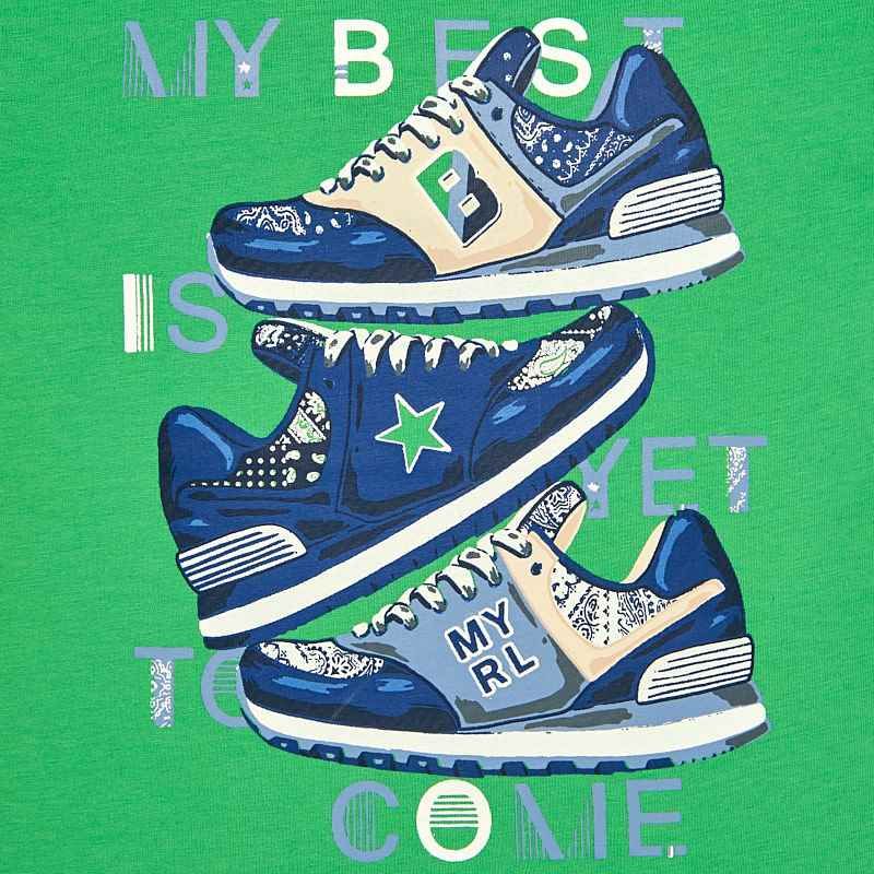 Zelené tričko s teniskami a pruhované triko.