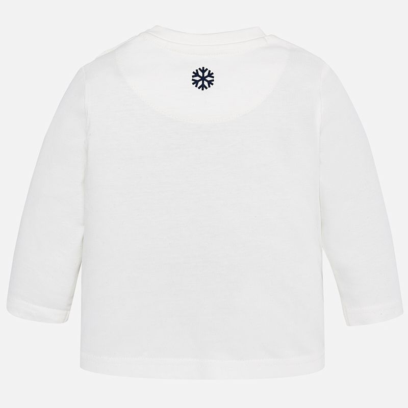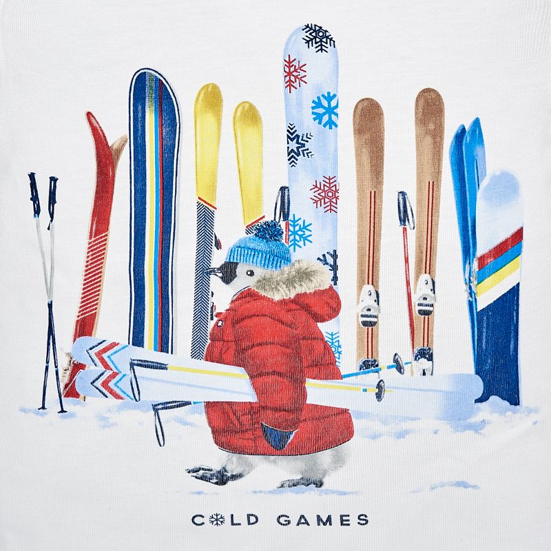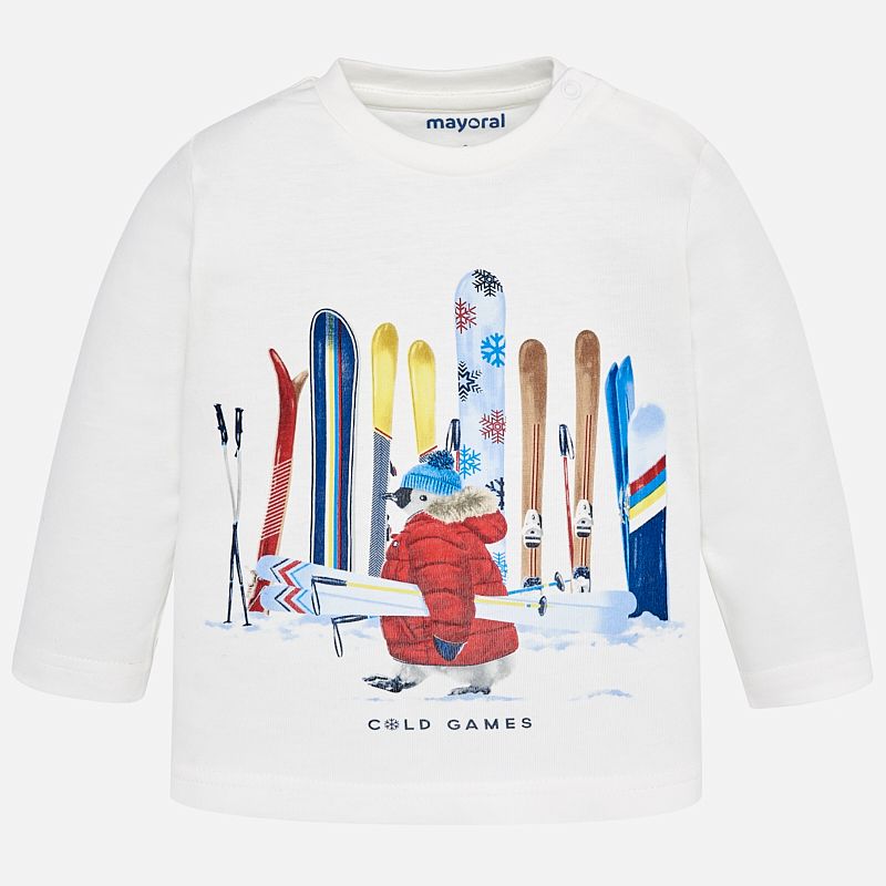 Krásné bílé tričko s dlouhým rukávem ideální pro podzimní sezónu pro malého chlapečka od kvalitní španělské značky MAYORAL. Jednoduché triko s kulatým výstřihem a obrázkem tučňáka s lyžemií pro velkou radost malých rarášků.