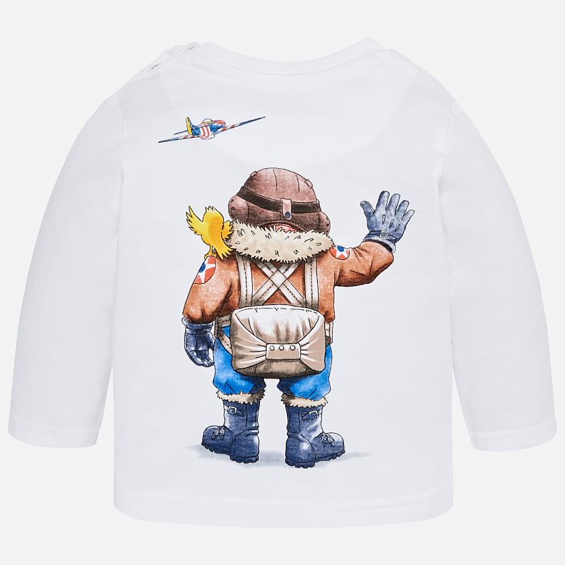 Krásné bílé tričko s dlouhým rukávem ideální pro malého chlapečka od kvalitní španělské znnačky MAYORAL. Jednoduché triko s kulatým výstřihem a obrázkem pilota na přední i zadní straně pro velkou radost malých rarášků.