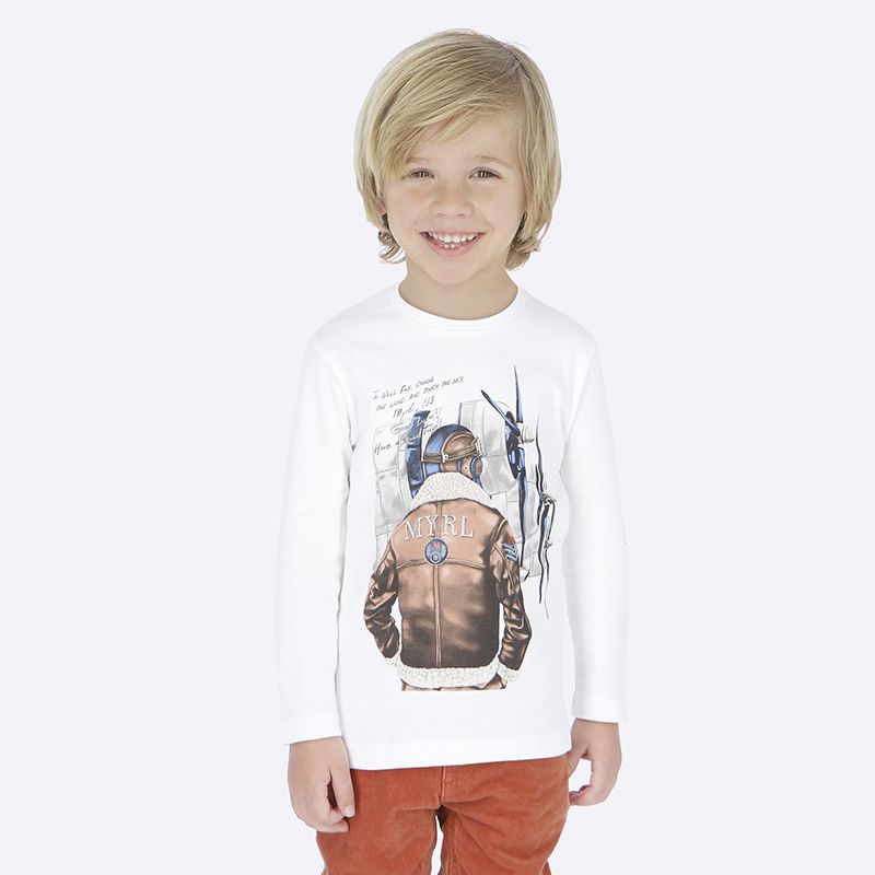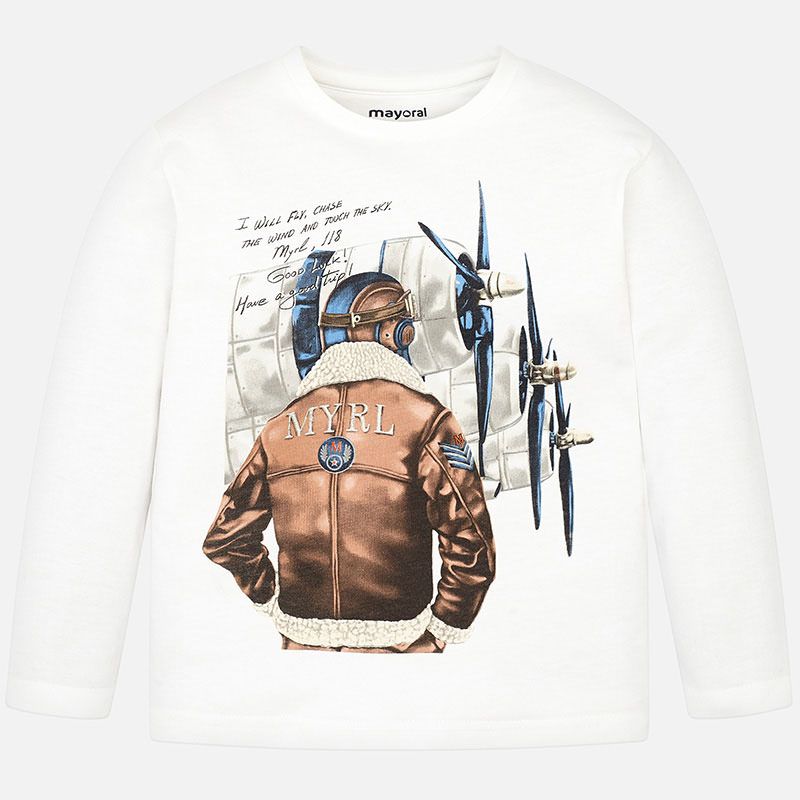 Krásné bílé tričko dlouhý rukáv s pilotem vybírajícím letoun pro chlapečka od kvalitní značky MAYORAL.