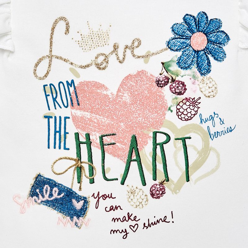 Krásné triko plné srdíček pro malou parádnici od kvalitní italské značky MAYORAL. Bílé tričko s kanýrky na ramínkách.