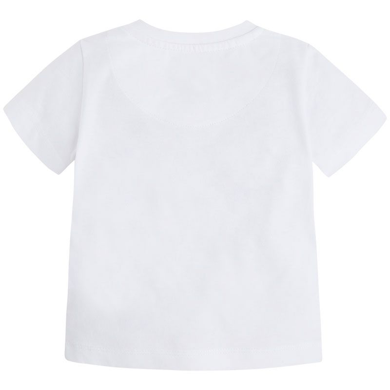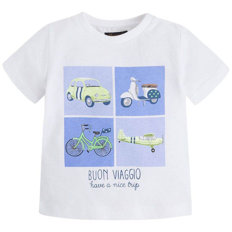 Krásné bílé tričko s krátkým rukávem ideální pro letní sezónu pro malého chlapečka od kvalitní španělské značky MAYORAL. Jednoduché triko s kulatým výstřihem s tipem na cestování pro velkou radost malých rarášků.