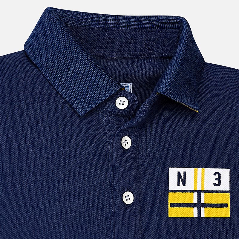 Krásné  POLO tričko s krátkým rukávem ideální pro jarní sezónu pro malého chlapečka od kvalitní španělské značky MAYORAL. Elegantní POLO triko v námořnickém design. Na zadní části a rukávku číslo.