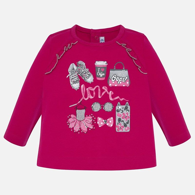 Krásné tričko dlouhý rukáv pro holčičku od kvalitní značky MAYORAL. Malinové tričko dlouhý rukáv s modními dopňky a ozdobené volánkem.