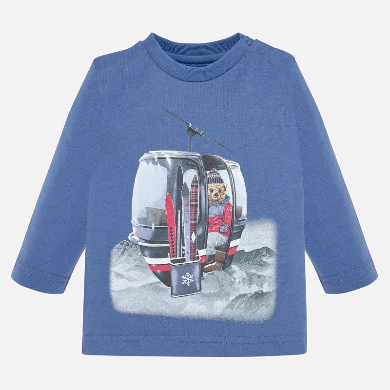 Krásné modré tričko s dlouhým rukávem ideální pro podzimní sezónu pro malého chlapečka od kvalitní španělské značky MAYORAL. Jednoduché triko s kulatým výstřihem s medvídkem jedoucím lyžovat pro velkou radost malých rarášků.