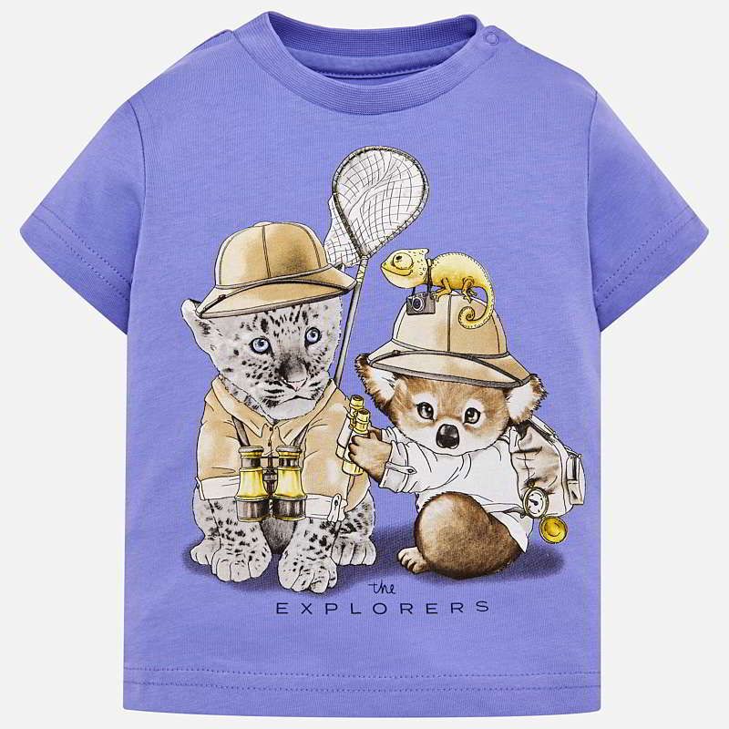 Krásné modré tričko s krátkým rukávem ideální pro letní sezónu pro malého chlapečka od kvalitní španělské značky MAYORAL. Jednoduché triko s kulatým výstřihem a obrázkem malých lovců pro velkou radost malých rarášků.