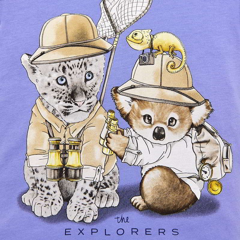 Krásné modré tričko s krátkým rukávem ideální pro letní sezónu pro malého chlapečka od kvalitní španělské značky MAYORAL. Jednoduché triko s kulatým výstřihem a obrázkem malých lovců pro velkou radost malých rarášků.
