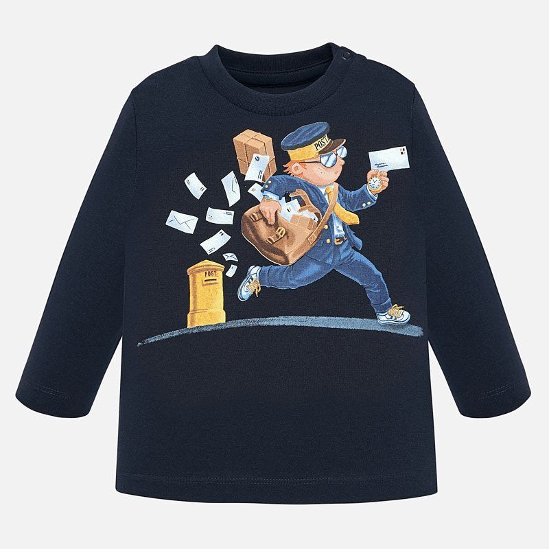 Krásné modré tričko s dlouhým rukávem ideální pro podzimní sezónu pro malého chlapečka od kvalitní španělské značky MAYORAL. Jednoduché triko s kulatým výstřihem a obrázkem pošťáka nesoucího noviny pro velkou radost malých rarášků.
