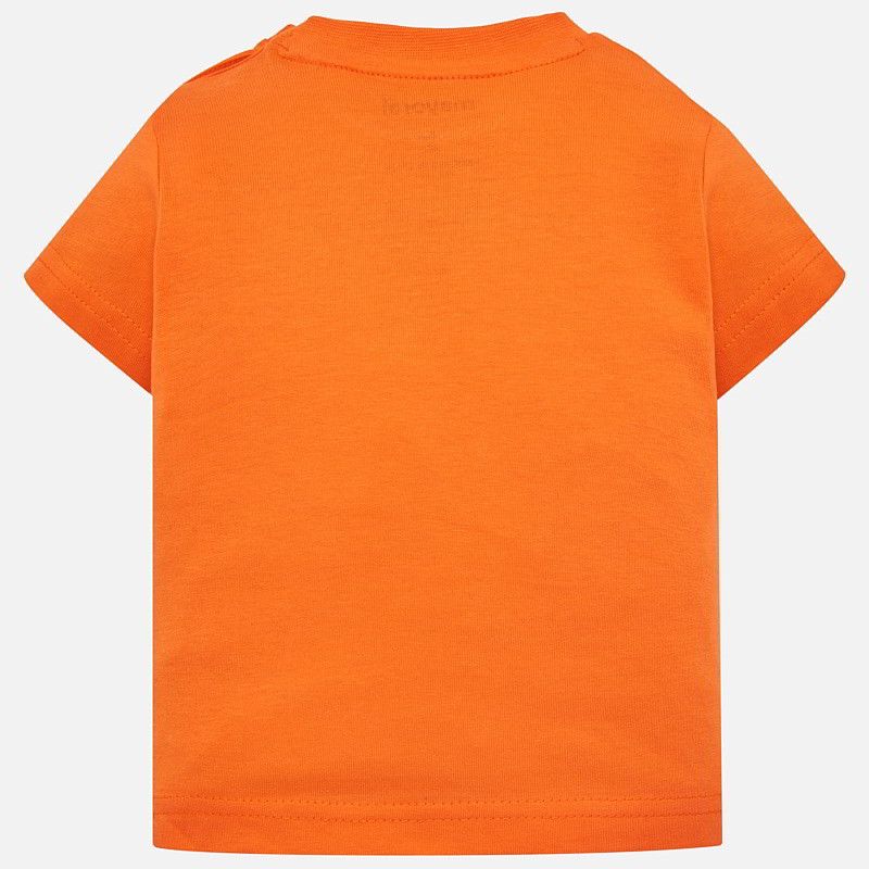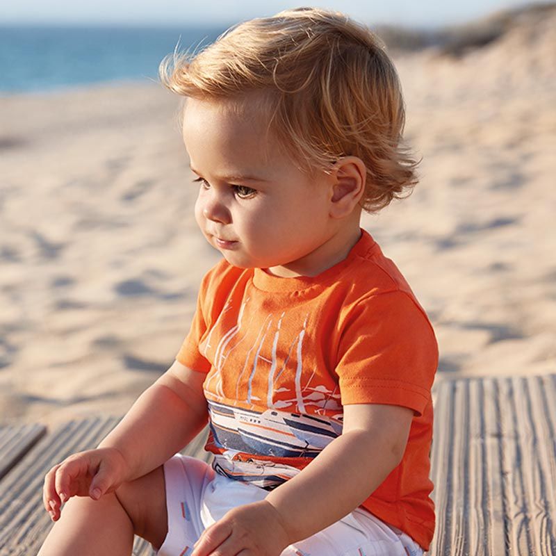Krásné oranžové tričko s krátkým rukávem ideální pro letní sezónu pro malého chlapečka od kvalitní španělské značky MAYORAL. Jednoduché triko s kulatým výstřihem a obrázkem lodiček pro velkou radost malých rarášků.