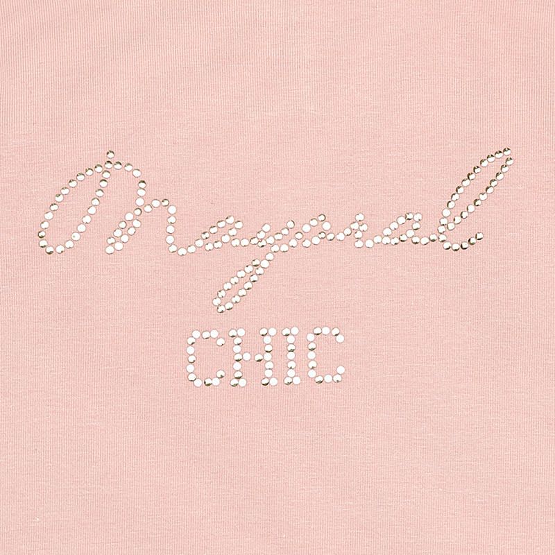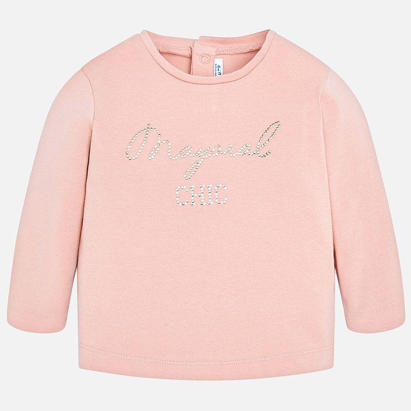 Krásné růžové tričko s dlouhým rukávem ideální pro všechny příležitosti od kvalitní španělské značky MAYORAL. Jednoduché triko s kulatým výstřihem a zlatým nápisem pro malou parádnici.