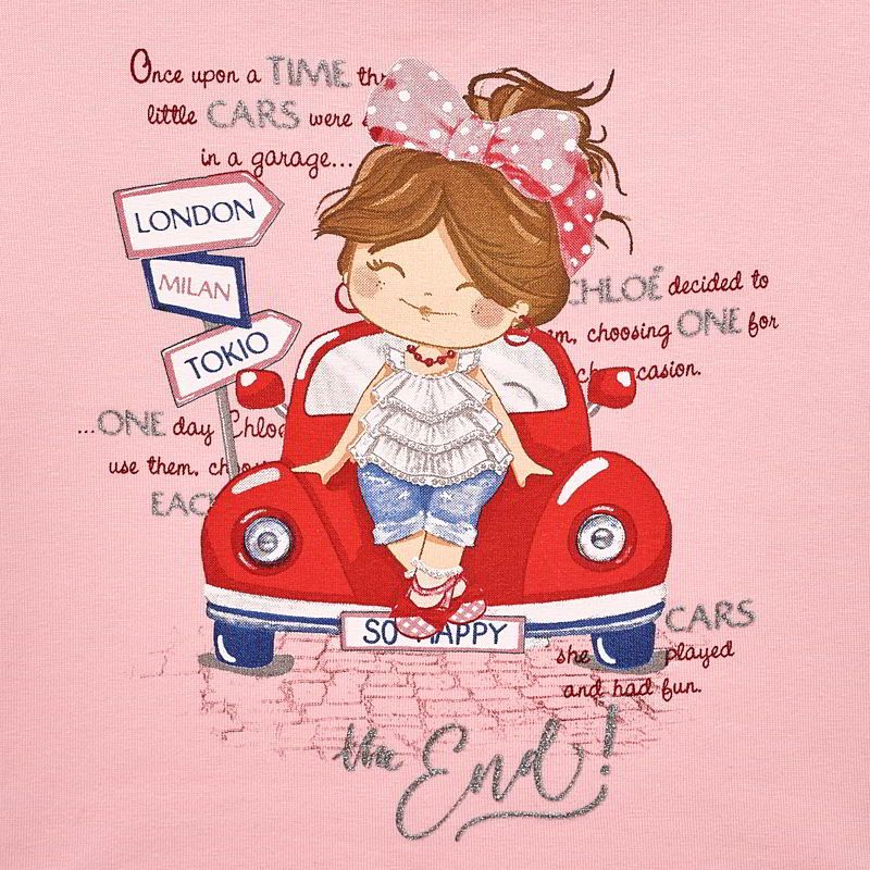 Růžové tričko dlouhý rukáv s holčičkou cestujicí autem po světě.