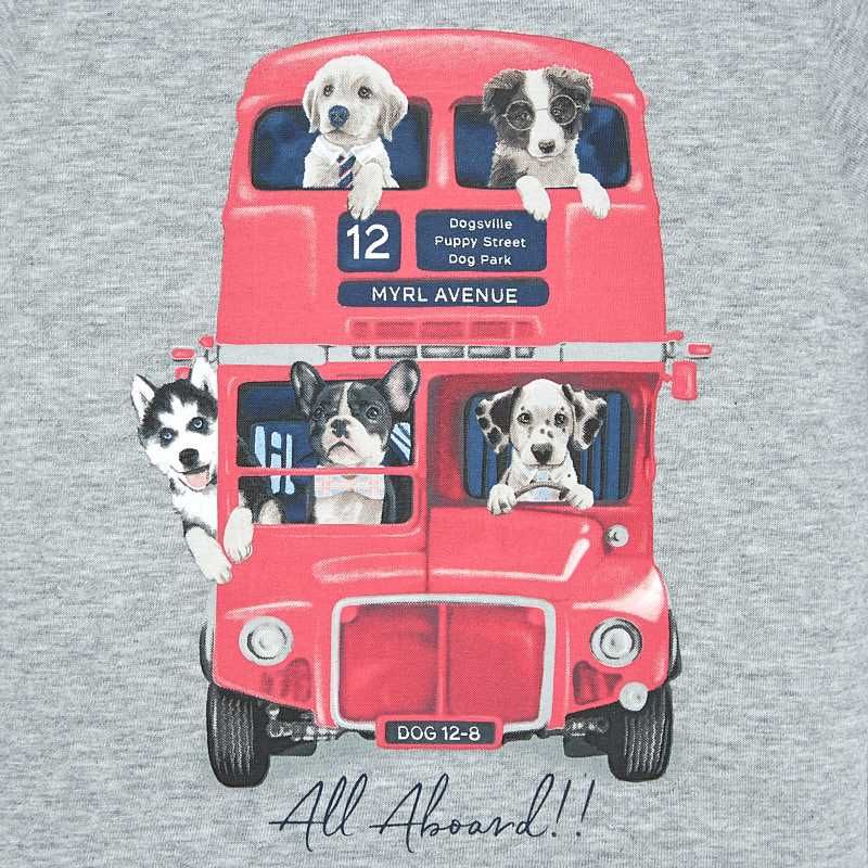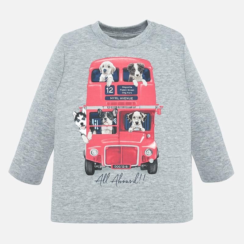 Krásné šedé tričko s dlouhým rukávem ideální pro podzimní sezónu pro malého chlapečka od kvalitní španělské značky MAYORAL. Jednoduché triko s kulatým výstřihem a obrázkem pejsků jedoucích na výlet autobusem pro velkou radost malých rarášků.