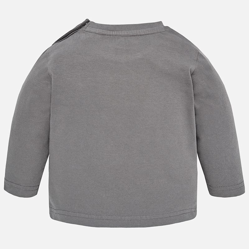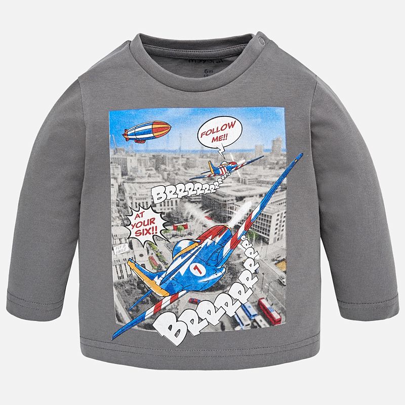 Krásné šedé tričko s dlouhým rukávem ideální pro malého chlapečka od kvalitní španělské značky MAYORAL. Jednoduché triko s kulatým výstřihem a obrázkem letadla nad velkoměstem pro velkou radost malých rarášků.