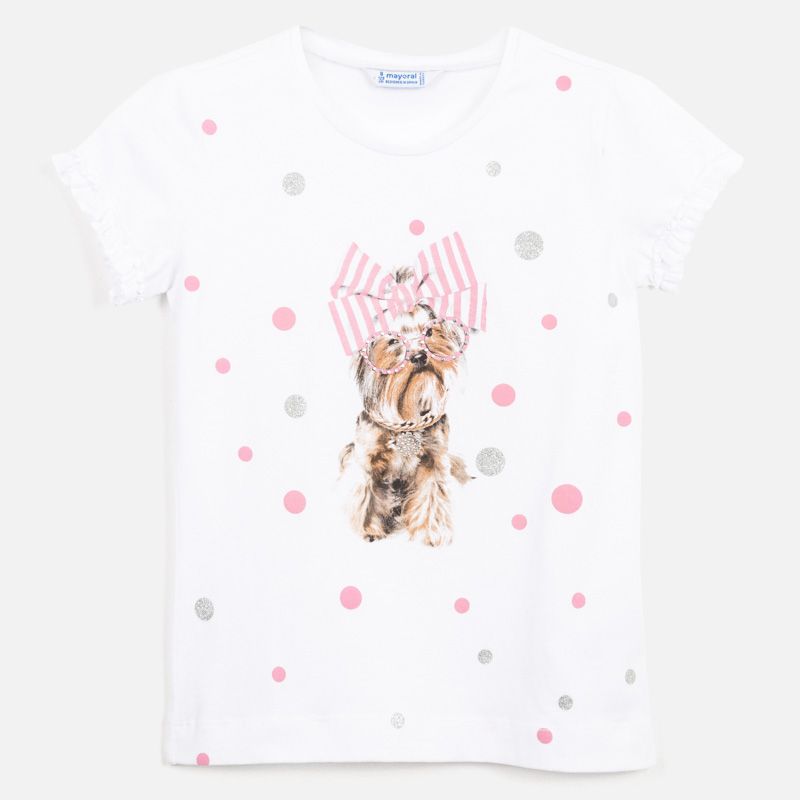 Letní bílé tričko s krátkým rukávem s pejskem pro holčičky od kvalitní španělské značky MAYORAL.