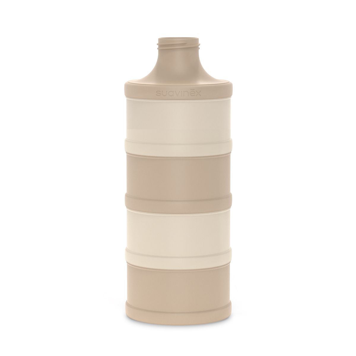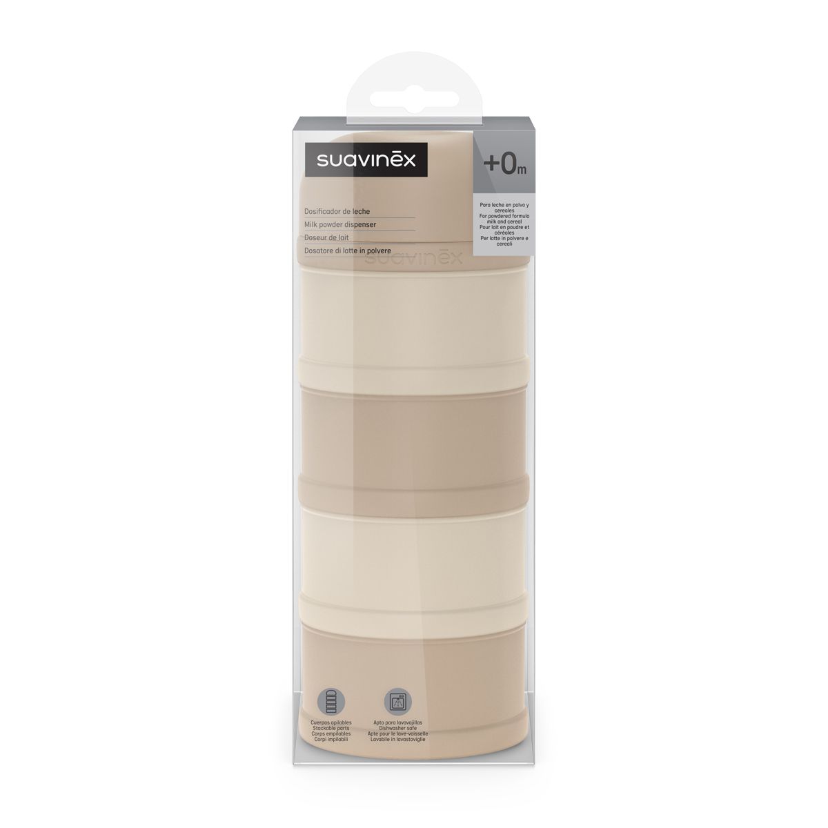 Dávkovač sušeného mléka značky Suavinex se šroubovacím uzávěrem a stohovatelnými přihrádkami. Obsahuje 4 samostatné části.