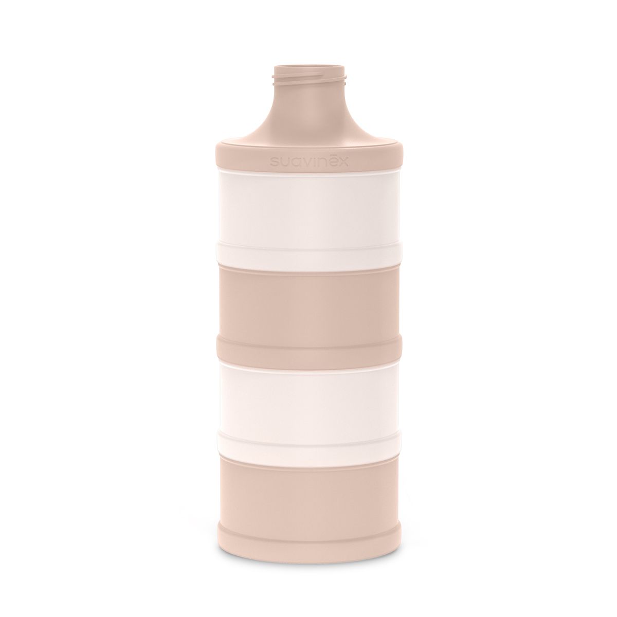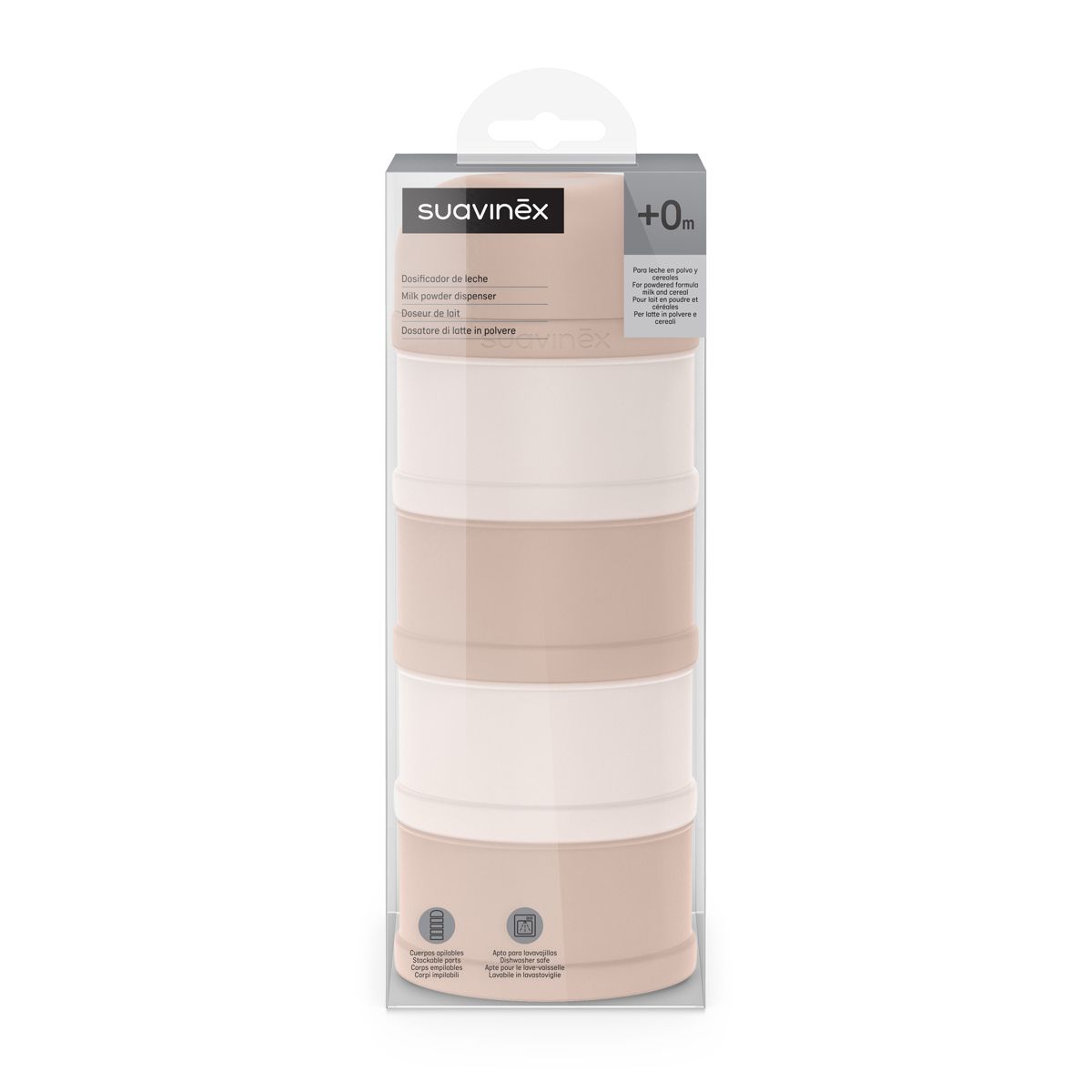 Dávkovač sušeného mléka značky Suavinex se šroubovacím uzávěrem a stohovatelnými přihrádkami. Obsahuje 4 samostatné části.